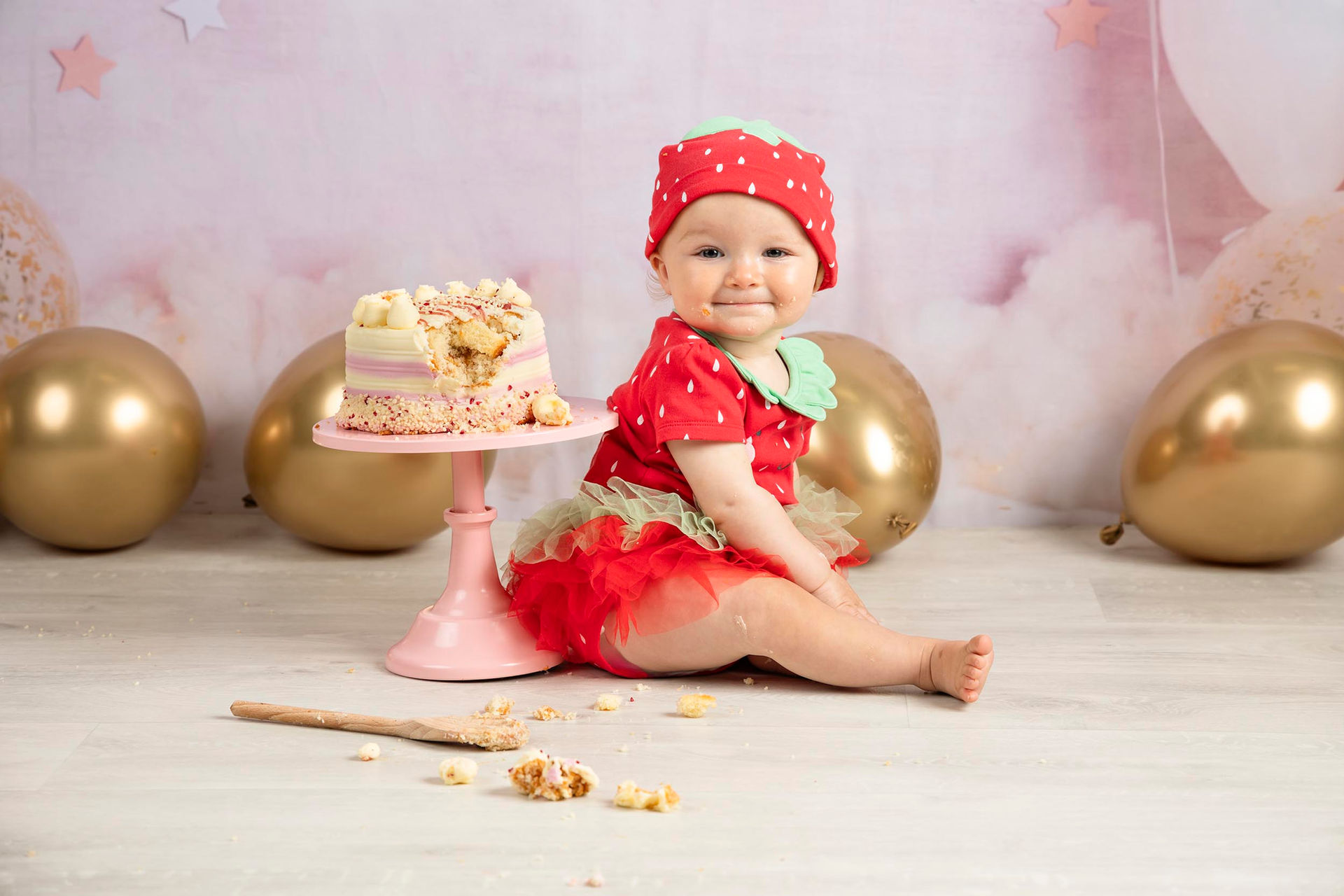 Children's cake smash photo shoot sessions take place at our photography studio in Gosport, Hampshire. Capturing your child's milestone while your little one has fun, plus we clear up the mess.